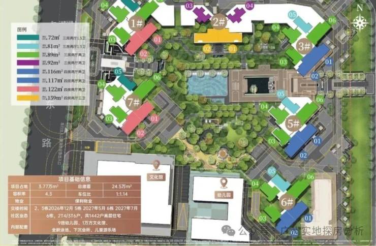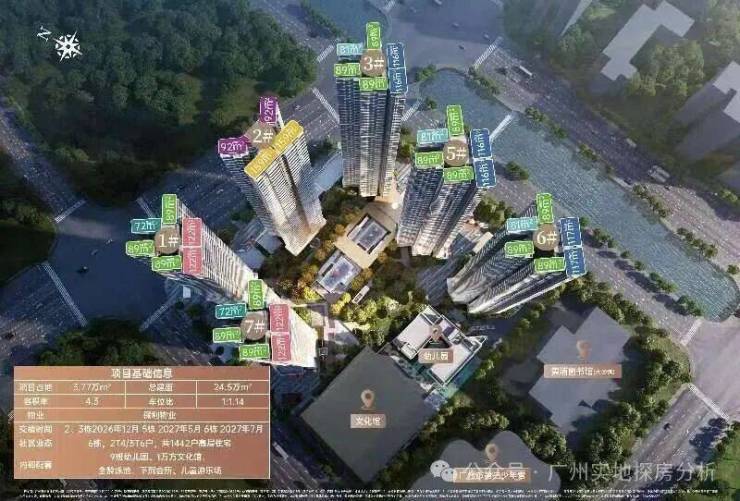 项目采用围合式设计,6栋47层高塔楼设计,小区自身配建有文化体育场馆和幼儿园,除了2#楼王是两梯四户,其余均为三梯六户,8#是5层高的文化馆,9#是配建3层高的幼儿园。