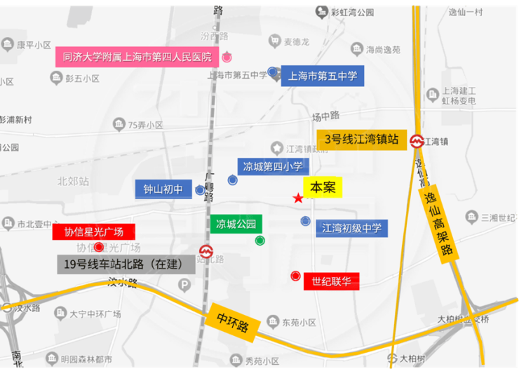 交通方面:项目距离3号线江湾镇站直线距离约900米。19号线(在建)车站北路站直线距离仅200m,将来出行十分便捷。自驾方面,周边有中环高架、南北高架、逸仙路高架等快速路。