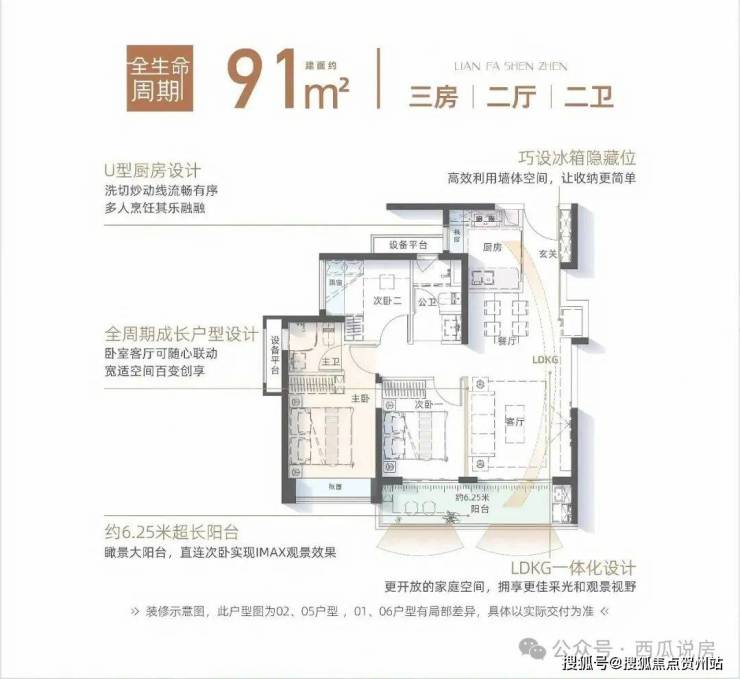 91㎡户型拥享约6.25米南向超长阳台,创变LDKG一体化设计,满足青年家庭成长需求。