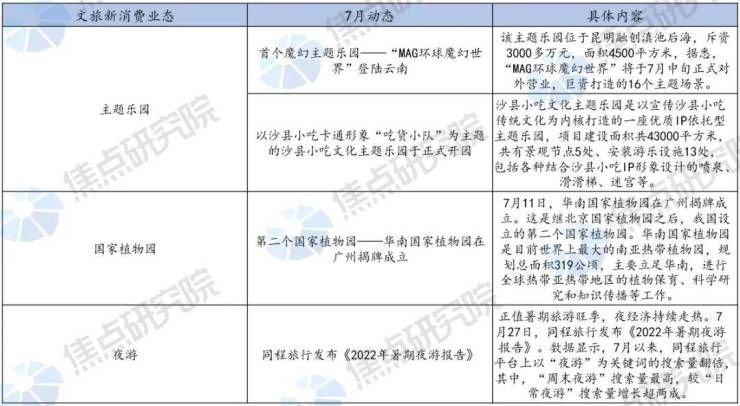 7月,文化和旅游部办公厅于7日印发《关于将旅游专列业务纳入跨省旅游“熔断”机制统一管理的通知》。即日起,恢复旅行社和在线旅游企业经营旅游专列业务;另有文化和旅游部等十部门日前印发《关于促进乡村民宿高质量发展的指导意见》,提出到2025年,初步形成布局合理、规模适度、内涵丰富、特色鲜明、服务优质的乡村民宿发展格局。文旅新消费方面,国内排名前列魔幻主题乐园——“MAG环球魔幻世界”登陆云南。另有以沙县小吃卡通形象“吃货小队”为主题的沙县小吃文化主题乐园于7月15日正式开园。此外7月27日,同程旅行发布《2022年暑期夜游报告》。数据显示,7月以来,同程旅行平台上以“夜游”为关键词的搜索量翻倍,其中,“周末夜游”搜索量较高,较“日常夜游”搜索量增长超两成。