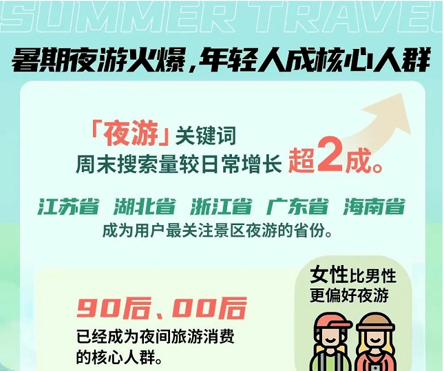 正值暑期旅游旺季,夜经济持续走热。7月27日,同程旅行发布《2022年暑期夜游报告》。数据显示,7月以来,同程旅行平台上以“夜游”为关键词的搜索量翻倍,其中,“周末夜游”搜索量较高,较“日常夜游”搜索量增长超两成。从用户关注区域来看,江苏省、湖北省、浙江省、广东省、海南省成为5个最关注景区夜游的省份。对不少有旅行需求的用户来说,白天“宅”酒店、商场,晚上夜游景区、城市成为暑期出行“标配”。《报告》显示,超过80%的用户认为,旅行目的地的夜游是旅行中最不能错过的环节。品尝街边美食、欣赏城市夜景、去景区看演出、散步放松等都成为人们选择夜游的理由。从夜游人群偏好分析来看,“90后”“00后”已经成为夜间旅游消费的核心人群,其中,女性比男性更偏好夜游。同程旅行平台数据显示,近一周的夜游景区类型中,主题公园以占比88%的特别优势成为优选,动植物园、自然风光、人文古迹、城市观光等类型紧随其后。2022年暑期夜间旅游消费活跃度较高的主要城市同样是拥有热门主题公园的城市,例如广州、武汉、西安、北京、苏州等。在景区游玩项目上,水上乐园、游船等项目受到了人们的青睐。
