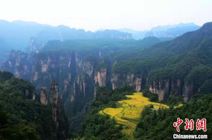 “我们收获的是稻谷,游客看到的是美景!”村民张自尚介绍,这块稻田面积57亩,因位于半空中的悬崖峰林之巅而得名空中田园,现由武陵源空中田园旅游开发有限公司管理,今年试种的是曾荣获中国中部农产品博览会金奖的“鱼泉贡米”品种,预计可以收获3万斤稻谷。