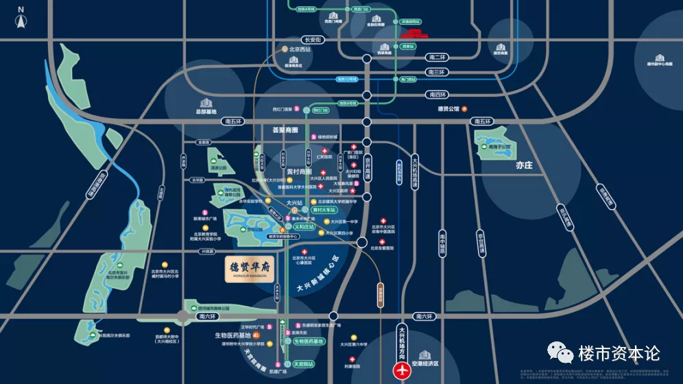 以德贤华府业主的视角看,由南往北串联起金融街、国贸、中关村、望京等多个产业心脏的地铁4号线,其义和庄站就位于德贤华府北侧不远,另一站点生物医药基地站则邻近德贤华府南侧。