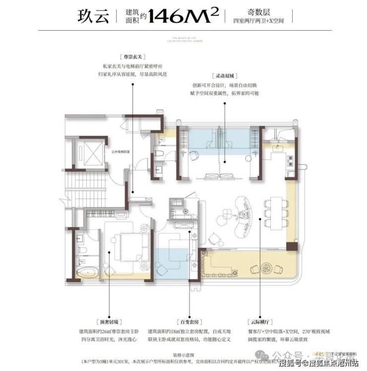 包含建筑面积约106-146㎡的三房和四房,是一个低密度的四代住宅小区,其中的130㎡和146㎡都是带空中花园的真四代户型。