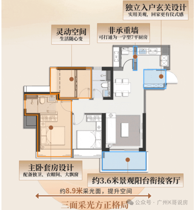 比如,采用少承重墙化设计,次卧可打通或隔开,生活阳台也能与厨房打通出7平全明空间。