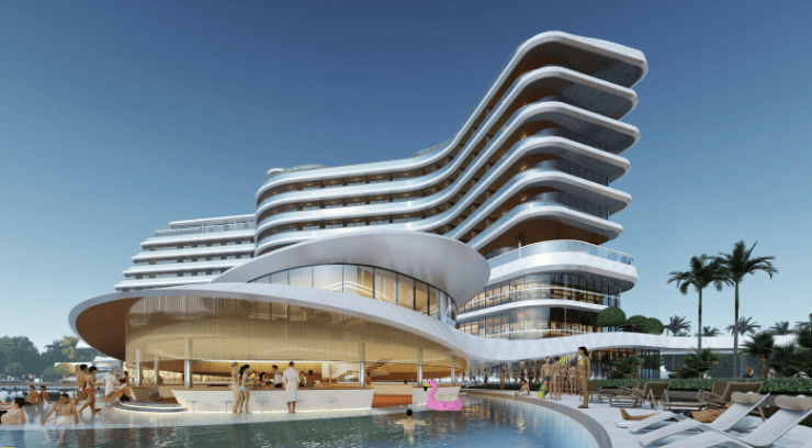 项目建设了约7.6万㎡的城市综合配套中心,不仅规划有五星级度假酒店、蝴蝶之眼亲水餐厅等景区豪配设施,还引进度假别墅酒店及康养度假中心。