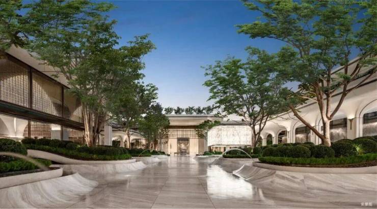 由安哥拉黑奢石打造的静谧水亭,曲水纳福,门庭显贵;照壁两旁,六棵百年红果冬青树阵列两侧,寓意家族昌盛。汇珠水,造归庭,是为归家的第一道礼序。