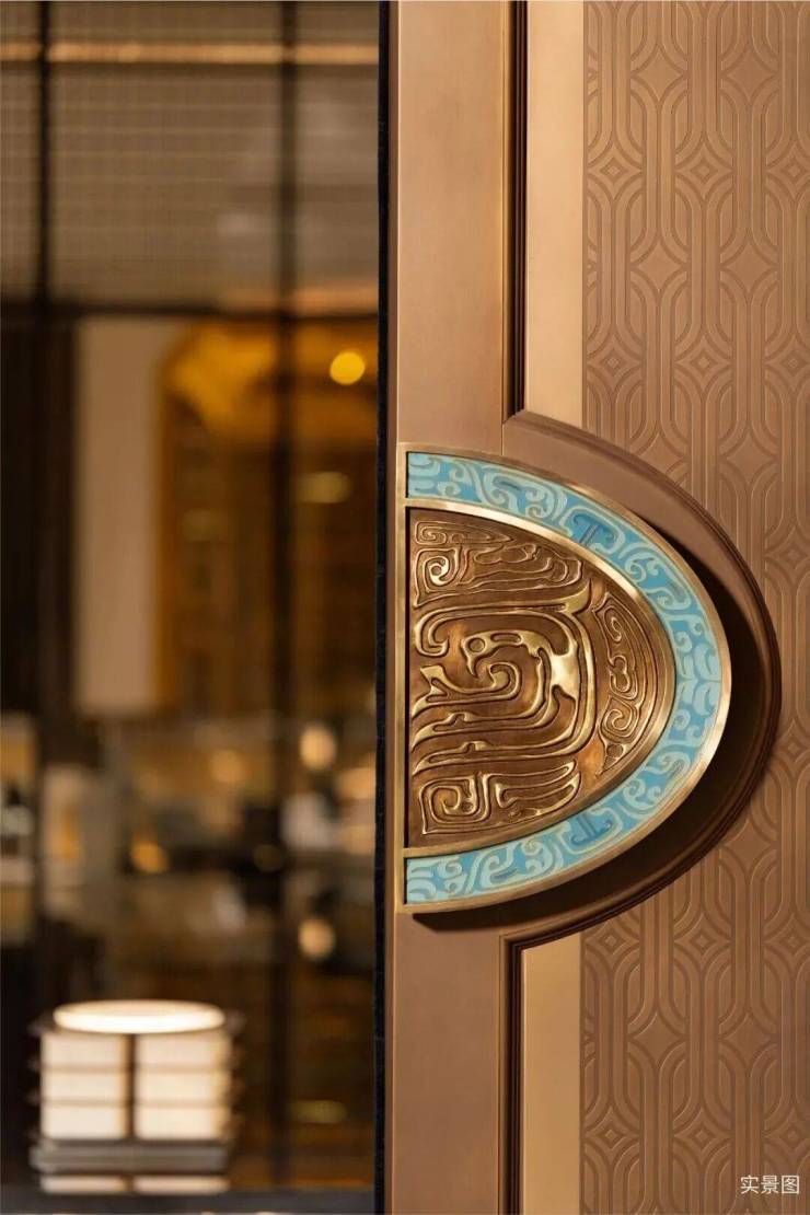 两吨重约7.5米高鎏金铜门,由我国国宝级非遗大师朱炳仁先生锻造,其中,铜金件上雕琢的凤鸟纹样,则取自北京保利艺术博物馆馆藏的海内孤品——周王鼎。步入此境,心绪于文明中穿梭,大家威仪自此展开。