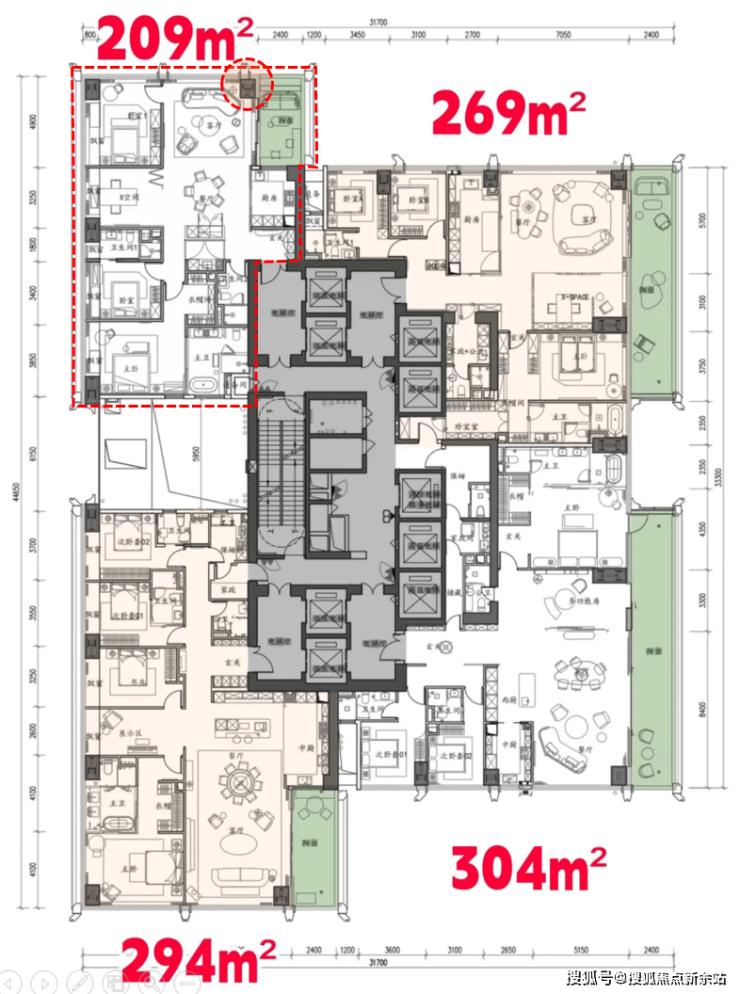 而最大户型1050平,从现在的平面布置来看略显小气。主要原因是核心筒的长度过大,导致两边的空间被分割的过于琐碎。