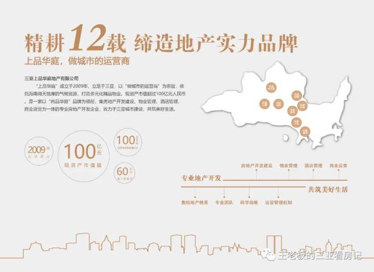 三亚上品华庭地产有限公司成立于2009年,公司实际投入资金约60亿元人民币,现资产市值超过100亿元人民币,已开发项目总面积近百万方。公司以“尚品华庭”品牌为领衔,集房地产开发建设、物业管理、酒店管理、商业运营为一体的专业房地产开发企业。