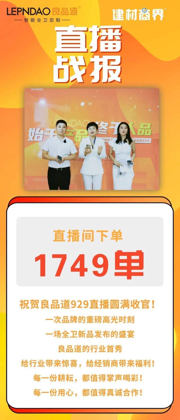 直播当晚截止凌晨12点,直播间总下单量达到了1749单,标志着此次推出的新品系列受到了全国各地经销商们的喜爱,更得到了市场的检验和认可。