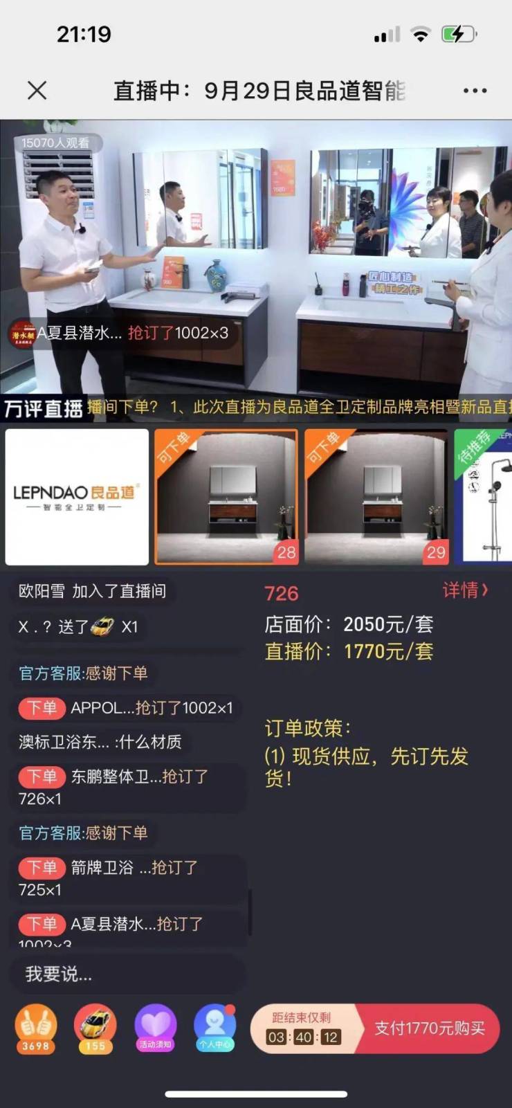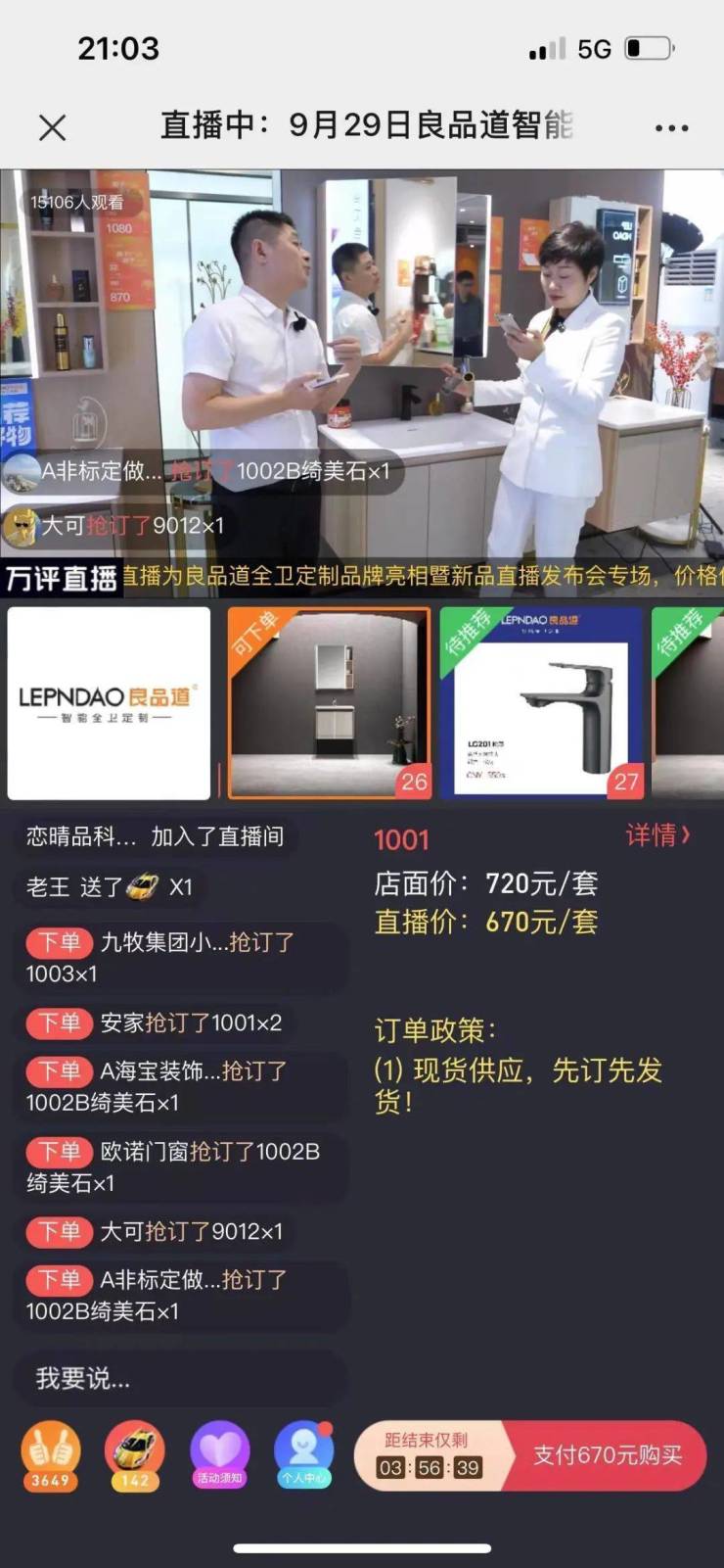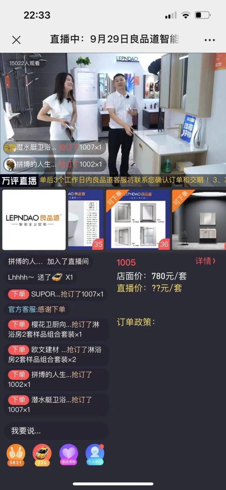 此次直播间中,隆重推出了良品道秋季新品:奶油风系列浴室柜、轻奢风系列浴室柜、现代简约风系列浴室柜、新中式风系列浴室柜、淋浴房系列、轻智能智能与标配马桶、花洒、龙头等,多位产品推荐官精彩解说,为经销商观众们带来了一场别开生面的视觉盛宴。