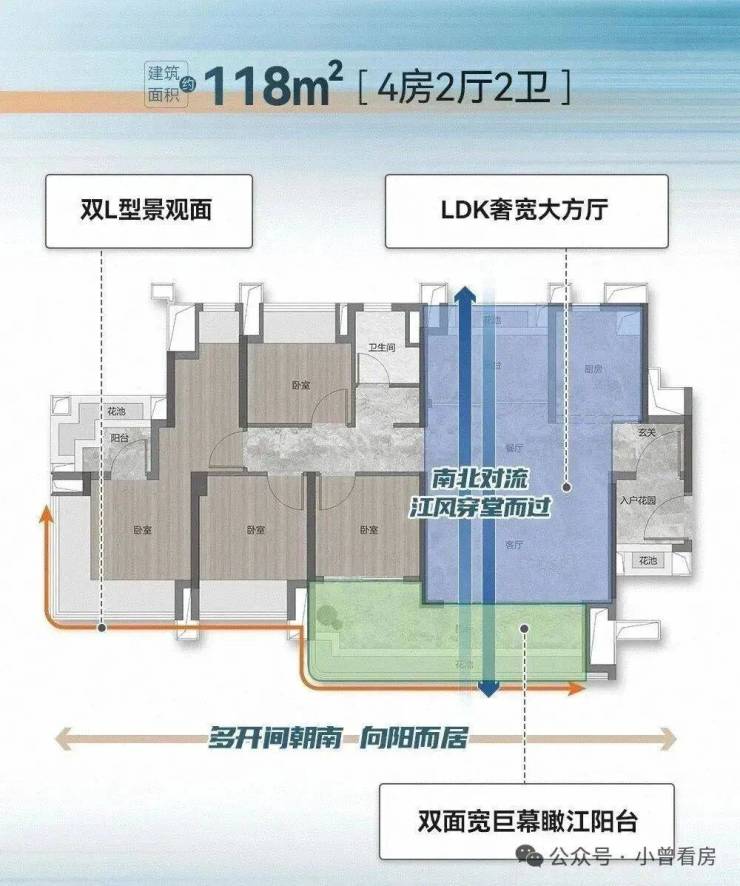 项目共规划4栋住宅楼,均为37层,分高低区设计,而且梯户比跟户型都各不相同: