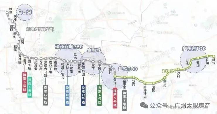 目前在建13号二期横跨黄埔天河越秀荔湾和白云五大主城区,比肩3号线黄金动脉,开通后无须换乘,一轨直达珠江新城(花城广场北站),尽享主城繁华