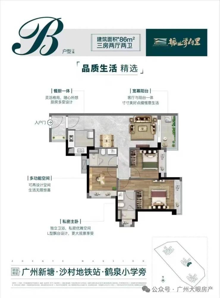75㎡三房,项目做出了新塘唯一的单边位设计,保证了南北对流和360°景观视野。