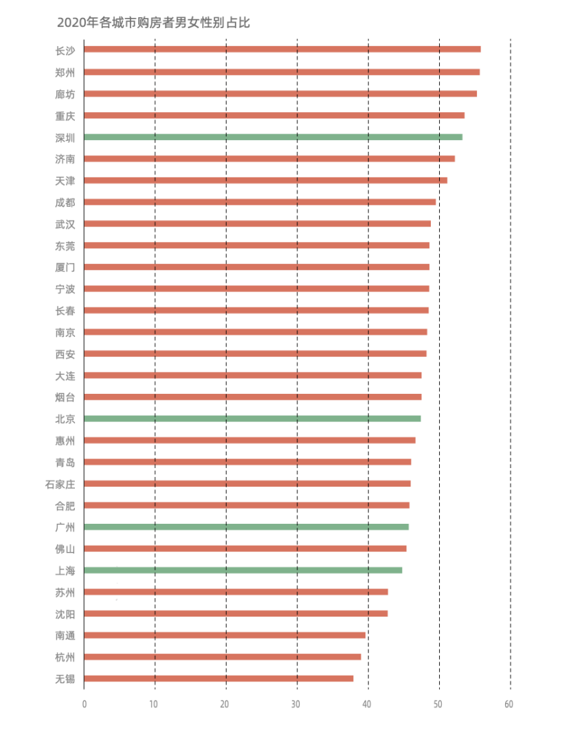 在房价更为平稳的长沙,女性购房占比高达55.81%,位列全国30个重点城市首位。郑州、廊坊、重庆、深圳、济南和天津女性“强势”购房,占比均超男性,成为当地房地产市场的主要贡献力量。而以上海为首,苏州、南通、杭州、无锡等长三角城市,将买房任务更多“拜托”给了男性,女性购房占比均不足45%,无锡甚至低至37.9%。