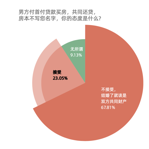 房产证上署谁名字则是另一个关注焦点。根据贝壳研究院调查,在“男方付首付贷款买房,共同还贷,房本不写你名字,你的态度是什么?”这一问题上,67.81%的受访女性表示“不接受”,认为婚后房产是双方共同财产,也有23.05%的受访女性对此“接受”。相对而言,独生女和已婚女性在面对房本上没有自己名字时更为淡定。