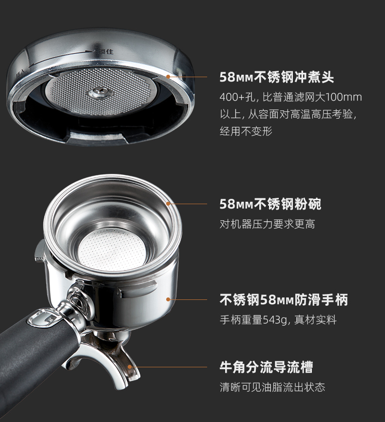 除了层层把关的温度和压力控制系统,东菱还兼顾到提升和稳定咖啡口感的加分功能。东菱研磨一体咖啡机的冲煮头、粉碗、手柄均采用商用级标准的58mm大口径,不锈钢的材质更不惧高温高压考验,远超众多家用机性能,为咖啡技术控带来万元高配机般体验,在家也能畅享星级咖啡。