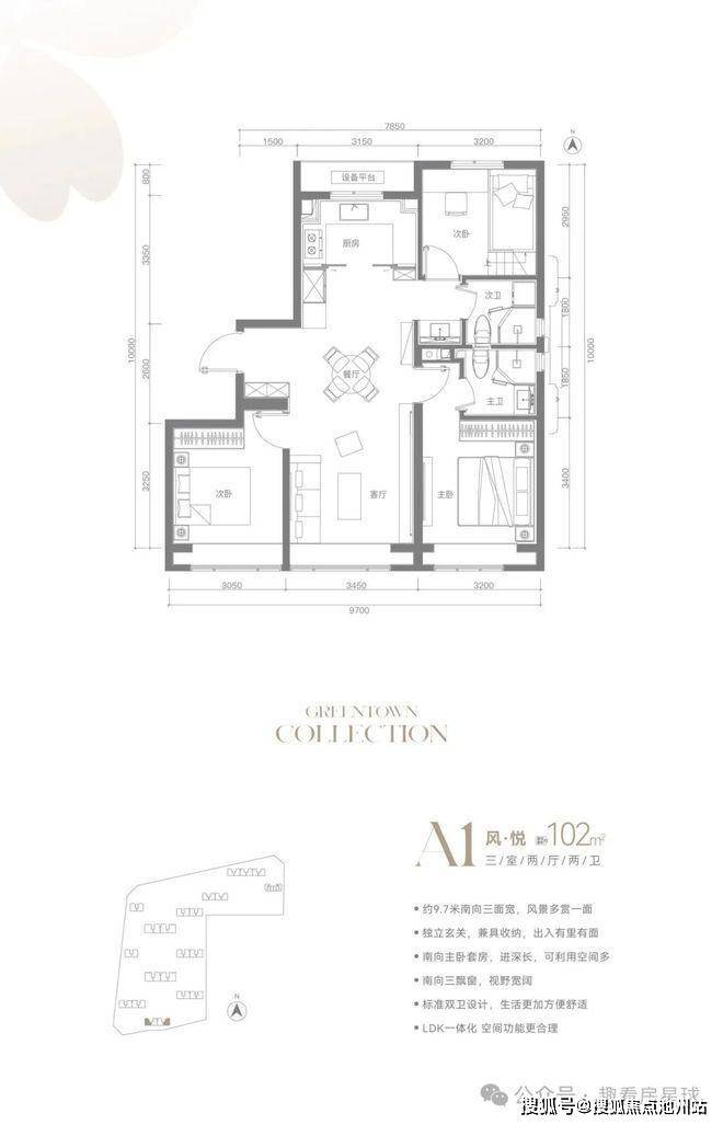 建面约102㎡三居实现双卫配置,主卧套房带L型飘窗,可改造为咖啡角或阅读区