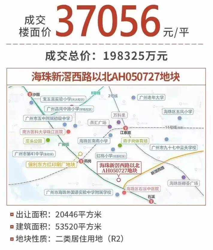 海珠新滘西路以北地块,2023年12月被中建信和(中建五局)以19.8亿总价拿下,折合楼面价约3.7万/平