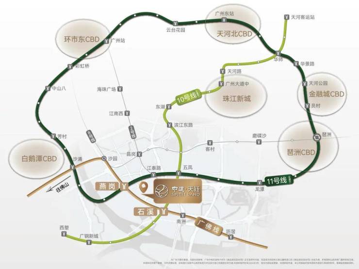 譬如地铁方面,中建天钰位于石溪站(广佛线&10号线)和燕岗站(广佛线&10号线)中间,可以说是双地铁站 x 三地铁线项目。
