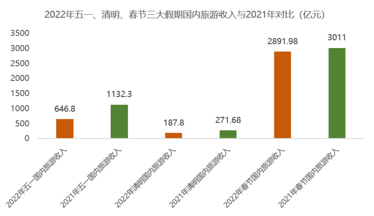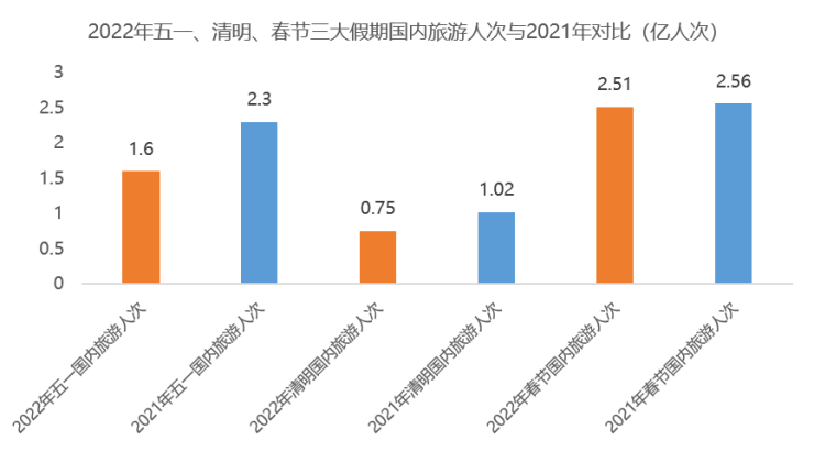 经文化和旅游部数据中心测算,2022年五一假期5天,全国国内旅游出游1.6亿人次,同比减少30.2%,按可比口径恢复至疫情前同期的66.8%;实现国内旅游收入646.8亿元,同比减少42.9%,恢复至疫情前同期的44.0%。就铁路、民航两大交通运输系统来看,假期前四日(4月30日至5月3日),全国铁路日均发送旅客306.38万人次,同比减少约80%;国内航线五一期间实际执行客运航班量1.67万班,同比2021年下降75.30%。