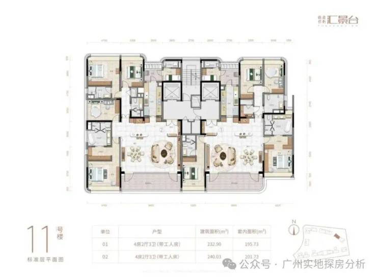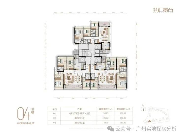 项目由14栋12层小高层组成,涵盖123-352㎡三至五房,共8类户型。