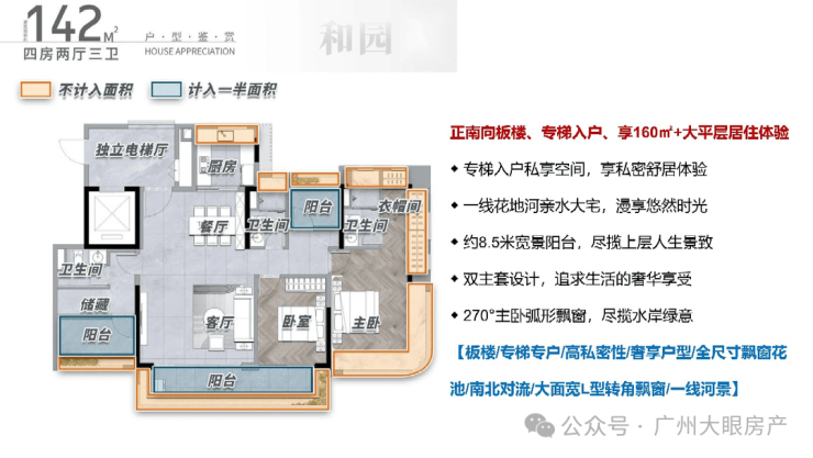 142方,2梯2户+独梯入户的设计,将私密性拉满,厅出阳台即是花地河水景,双主卧大面积+8.5m宽景阳台的设计满足多使用场景,北阳台可望花地河水景,南飘窗可望园林,景色全览。