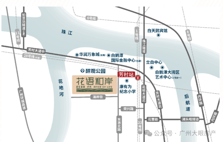 项目北侧是花地河,直线距离约50米,仅仅隔了一条花海街和绿道。