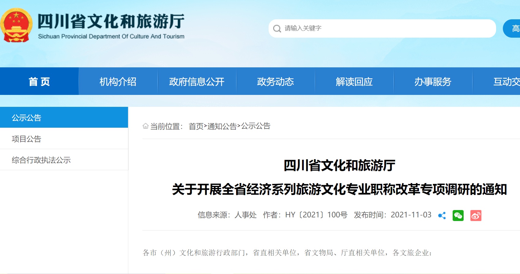 央广网北京11月3日消息 为落实中央深化职称制度改革和四川省委分类推进人才评价机制改革的要求,经研究,四川省文旅厅决定在全省范围内开展经济系列旅游文化专业职称改革专项调查研究,并发布《关于开展全省经济系列旅游文化专业职称改革专项调研的通知》(以下简称《通知》)。现就相关事宜通知如下: