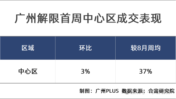 根据合富研究院数据显示,广州解限首周,全市成交总体上涨1%,其中中心区周环比上涨3%,较8月周均上涨37%,稳中向好。