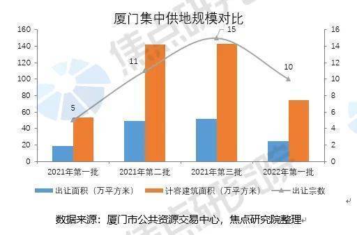 3月24日,厦门排名前列批次土拍正式结束,本批次共有10宗住宅用地正式公告,开拍后有1宗取消交易,9宗地块成功出让。10宗出让面积为24.25万平方米,较2021年第三批次减少53.3%,计容建筑面积为74.13万平方米,较2021年第三批次下滑48.1%,起始总价为184.3亿元,较2021年第三批次减少近半,本批次供求面积和出让地块数量较2021年第三批次均大幅减少。厦门2022年供地计划显示,本年度宅地供应累计有4次,一批次供应10宗宅地,剩余14宗分三次供应。预计本批次为2022年供应最多的一次。从供地结构方面来说,本次有5宗地块位于岛内,占比一半。