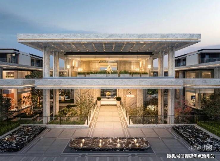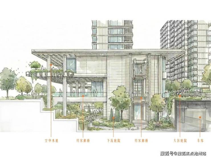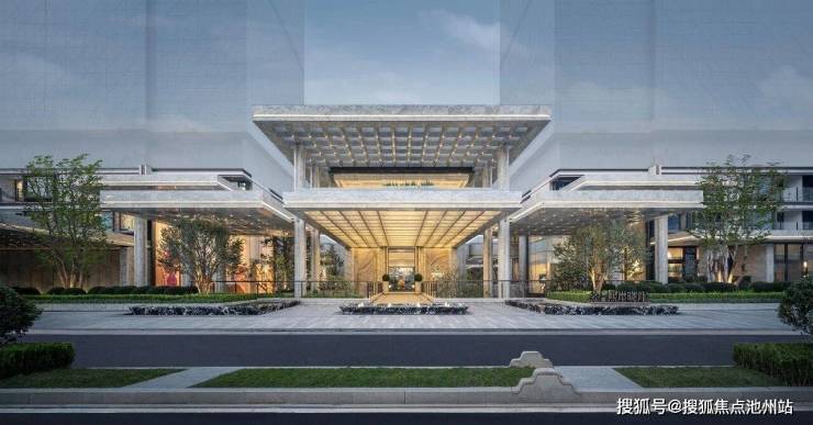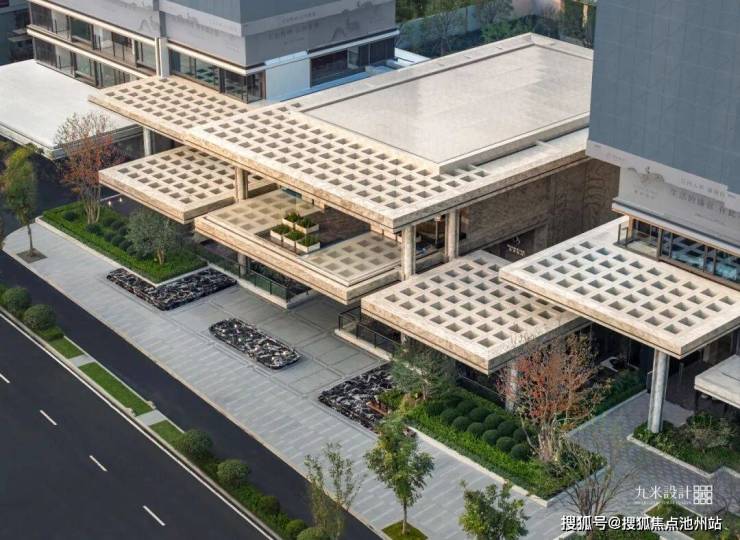 设计借鉴了立体空间理念,通过多标高平台与下沉庭院的叠合组织,突破了传统住区扁平化的空间格局,构建出层次丰富的立体庭院系统。行走于不同高差之间,视线与体验随之流转,社区因此成为一个可探索、可沉浸的“生活剧场”,在步移景异中重构人与环境的互动关系。主入口设计集中体现了“造景”与“借景”的传统园林智慧在现代社区中的创造性转化。长达近百米的沿街展示界面,通过规整的景观序列强化归家仪礼;同时巧妙将南侧河景“借”入园区,形成一道可呼吸的城市界面。由此,“河-院-宅”的水脉逻辑被清晰建立,自然气息由外至内层层渗透,赋予社区以持续流动的“生息”意向。