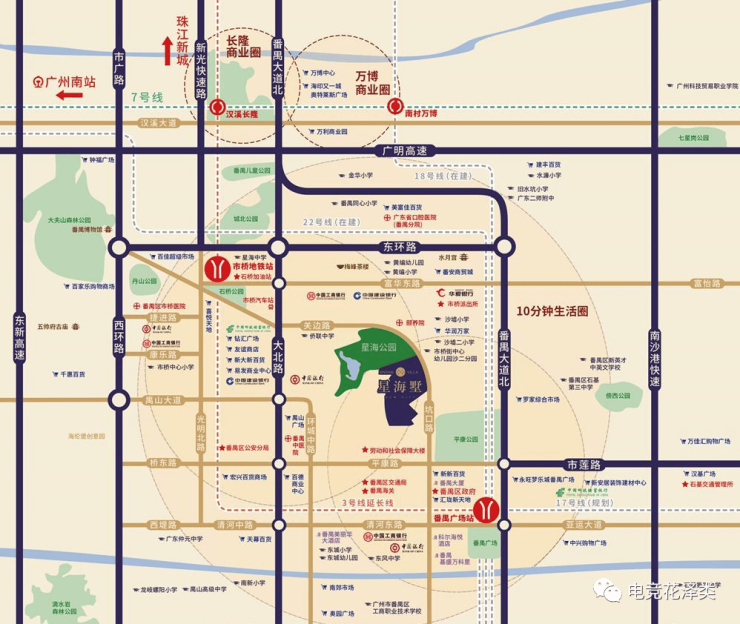 项目位于番禺城区中心市桥,东南为番禺广场、番禺区政府,西北紧邻星海公园,周边轨 道交通及路网完备,交通便捷。项目地处最成熟、最繁荣的市桥中心位置,旺中带静,高贵而不张扬,可谓是市桥 “中央居住区”内独立豪宅标杆。