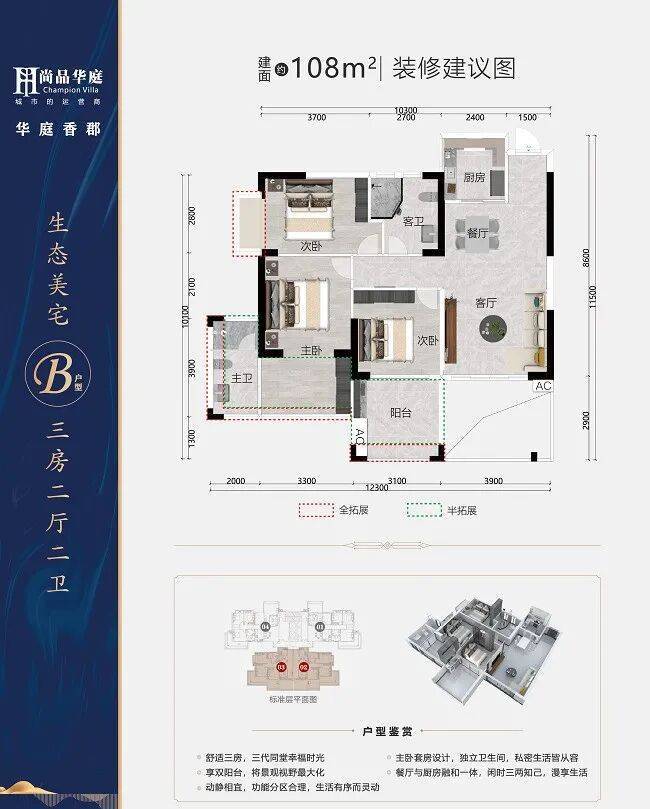 户型面积:108㎡三房两厅一卫、135㎡四房两厅两卫(得房率90%)
