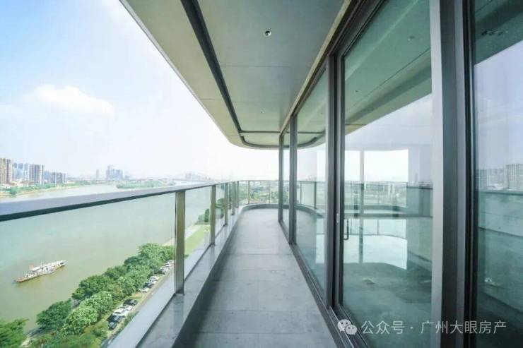 更震撼的体验,是当你步入阳台时。弧形玻璃的设计,让江景全画幅被你的视觉所占有,带来极强的视觉冲击力。驻足于此,你不需要去眺望江景,而是开阔的珠江直接将你环抱。