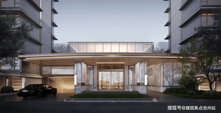 酒店式大门 ,以大面积奢石、铝板、玻璃打造极具仪式感的城市玄关,将精致、隐奢展现得淋漓尽致。