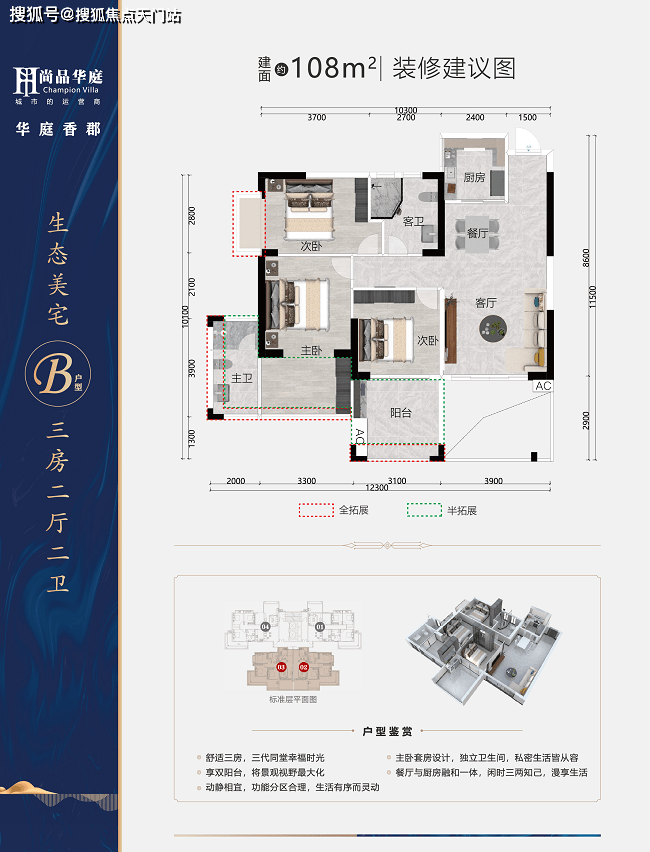户型面积:108㎡三房两厅一卫、135㎡四房两厅两卫(得房率90%)