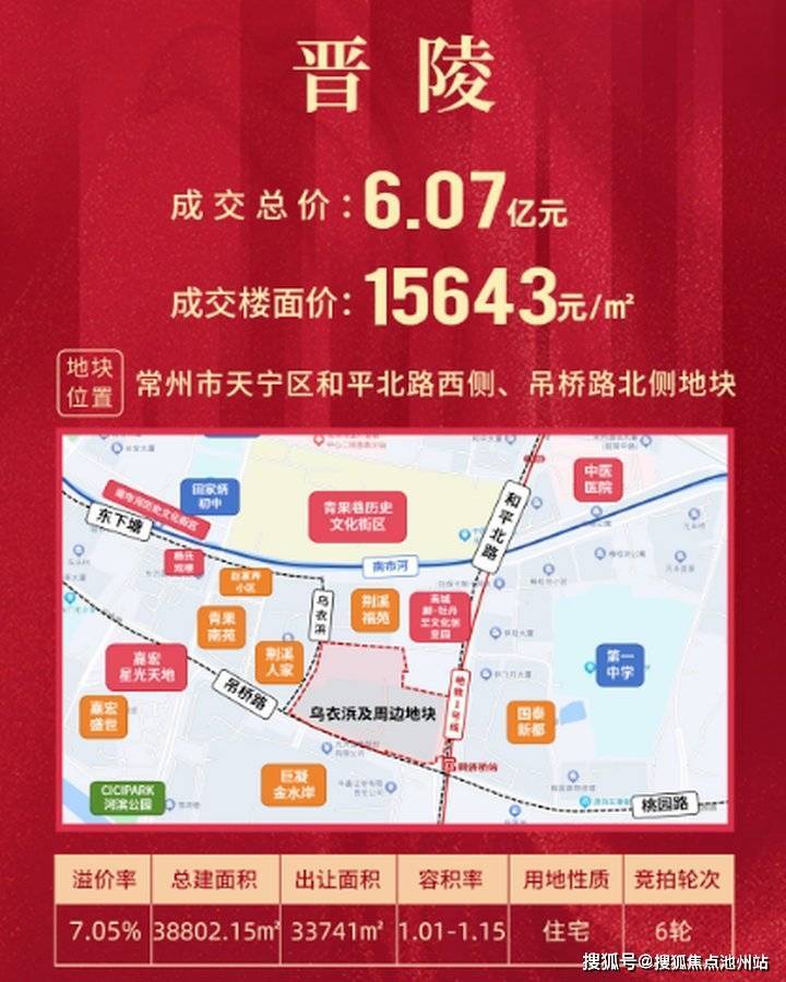 从地块基础信息来看,乌衣浜地块位于天宁区天宁街道,具体四至为东至规划地块、南至吊桥路、西至乌衣浜、北至陶沙巷,占地面积达33741㎡,用地性质为城镇住宅用地兼容≤5%的商业用地。2025年10月22日,该地块经过6轮激烈竞价,最终以6.07亿元成交,楼面单价定格在15643元/㎡,溢价率7.05%,成为当年常州主城区首宗成交宅地,足见市场对其区位价值与开发潜力的高度认可。地块规划指标尤为亮眼,容积率控制在1.01-1.15之间,建筑密度≤35%,绿地率≥25%,同时建筑高度限制在26.4米以内,这样的低密、低容规划,为打造高端舒适的居住体验奠定了坚实基础,也预示着项目将以多层、联排等低密产品形态为主。