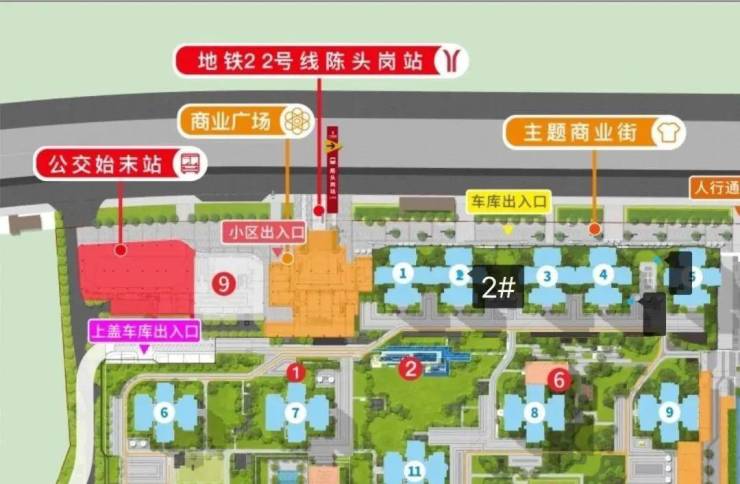 看2#位置,下楼就是地铁站、公交始末站、商业广场、小区及车库出入口、主题商业街等。
