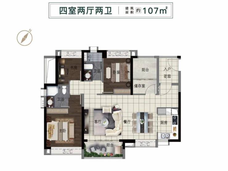 107㎡户型则是横厅设计,四开间朝南,两处灵动空间,可以灵活打造满足不同居住需求。书房、卧室、主卧、餐厅都带飘窗,解决收纳难题。