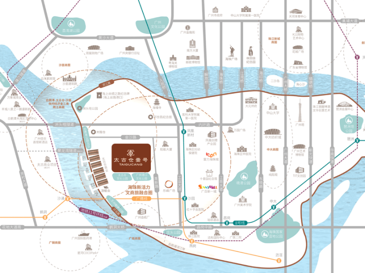 太古仓壹号坐拥传统老中轴延伸优势,串联白鹅潭商务区、聚龙湾综合体和太古仓等城市新人文地标,琶洲、白鹅潭、广钢、广纸等四大繁华商圈环绕,传统与现代兼文商旅圈,形成"水陆双循环"的顶级商圈格局。隔江对望聚龙湾太古、白鹅潭CBD,人文与艺术交相辉映,孕育全球前沿水岸生活的世界橱窗。