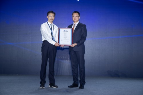 (配图:广检集团广纺院黄永钦院长为梦洁颁发产品认证证书)