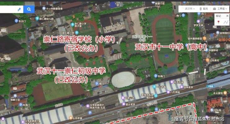 先说初中,与项目隔着京汉大道就是武汉十一崇仁初级中学,之前是公参民学校,也就是民办,实力非常强,“武汉十大名初”之一,位于武汉第一梯队。