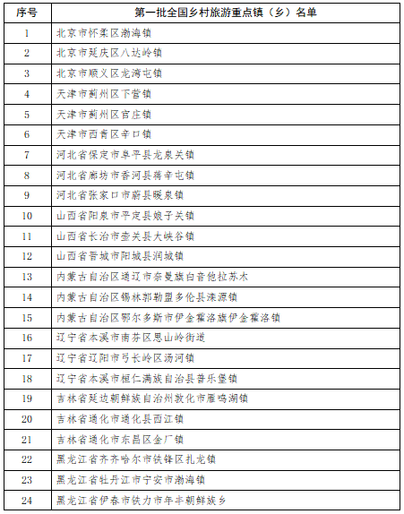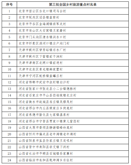 人民网北京9月2日电 (记者刘佳)为助力全面推进乡村振兴战略,提升乡村旅游发展质量和效益,日前,文化和旅游部会同国家发展改革委发布《关于公布第三批全国乡村旅游重点村和排名前列批全国乡村旅游重点镇(乡)名单的通知》(以下简称《通知》)。《通知》公布了第三批199个全国乡村旅游重点村名单和排名前列批100个全国乡村旅游重点镇(乡)名单。