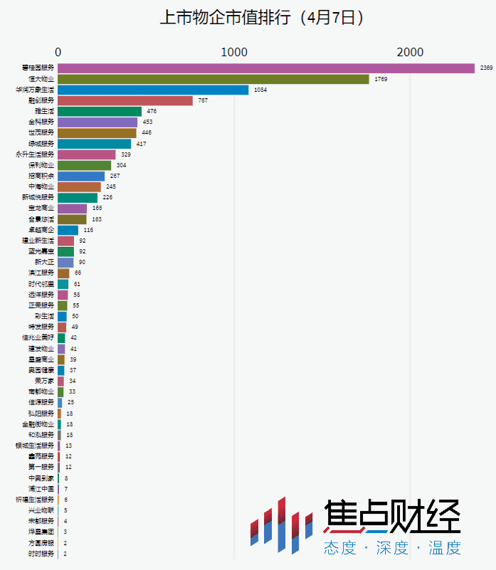从总额来看,截至4月7日,46家上市物企市值总额达10568.47亿港元,突破万亿。