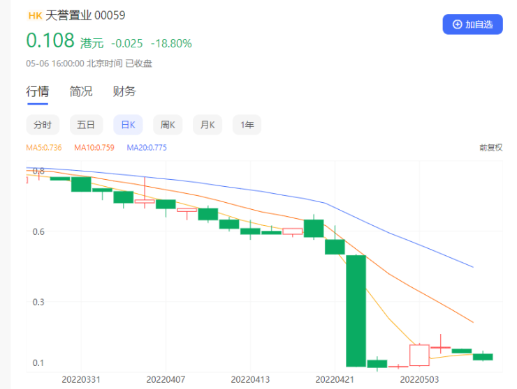 4月22日下午,百亿房企天誉置业(00059.HK)股价闪崩,从0.48港元跌至0.085港元,跌幅高达82.29%,总市值缩水至7.18亿港元,盘中不得不临时停牌,以待刊发内幕消息。