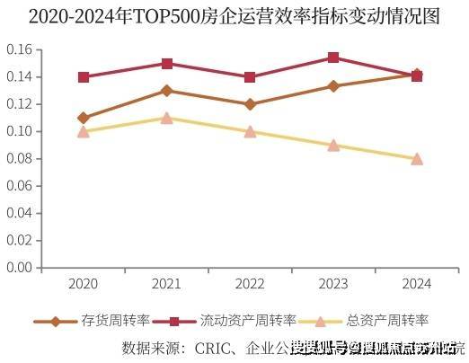 2024年TOP500房地产开发企业存货周转率均值为0.14,较上年上升0.01;流动资产周转率均值为0.14,较上年下降0.01;总资产周转率均值为0.08,较上年下降0.01。在保交付压力及降杠杆的迫切需求下,房企加快了周转速度,同时部分企业存货减值损失计提增加,存货规模缩水,TOP500房企存货周转率持续上升。市场信心低迷销售遇阻,TOP500房企营业收入下降,总资产周转率均值继续下滑。