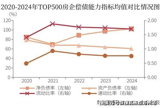从长期偿债能力看,TOP500房企2024年资产负债率均值为60.72%,较上年下降3.12个百分点;净负债率均值为102.50%,较上年上升5.58个百分点,净负债率连续三年上涨。短期偿债能力方面,2024年TOP500房企流动比率均值为1.70,较上年下降0.04;速动比率均值为0.75,较上年下降0.01,二者较上年均有小幅下滑。有八成的房企速动比率小于1,可变现的流动资产无法覆盖流动债务,短期偿债压力较大。