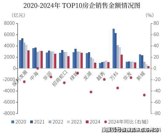 2024年TOP10房企中,仅有中海销售金额实现小幅正增长,其余9家房企全年销售金额同比下降。在市场持续下行期,企业间分化现象更加明显,民营房企同比降幅远高于央国企。2024年销售金额超过三千亿元的仅有中海、保利发展两家房企,数量较上年减少两家。当前市场对头部房企的投资能力提出了更高的要求,在核心城市优质地块出让带动下,头部房企拿地竞争激烈,房企维持销售规模存在较大压力。